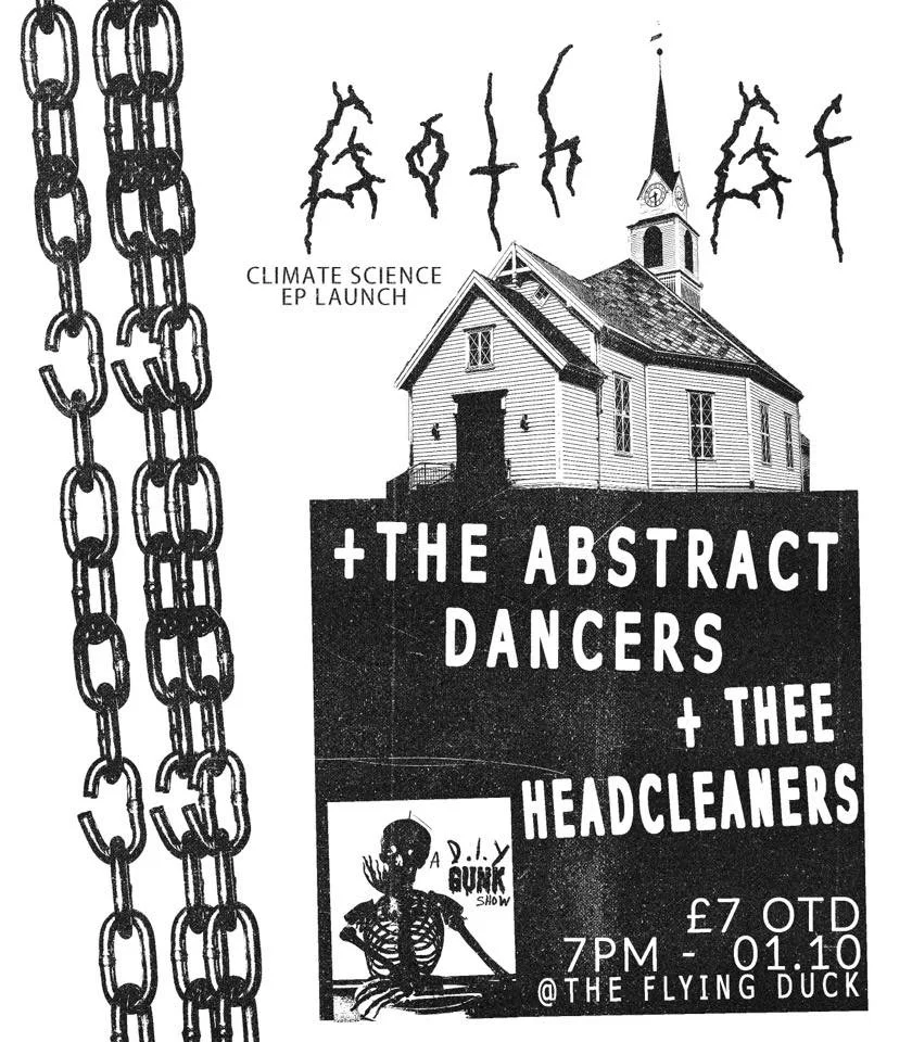 Goth GF / The Abstract Dancers / The Headcleaners Saturday 1 October 2022 19:00 22:00 Google Calendar ICS GOTH GF headline their first show in celebration of the release of the ‘Climate Science’ EP with support from The Headcleaners and The Abstract Dancers. Doors 7pmADVANCE TICKETS £5or £7 OTDTICKETS AVAILABLE HERE!