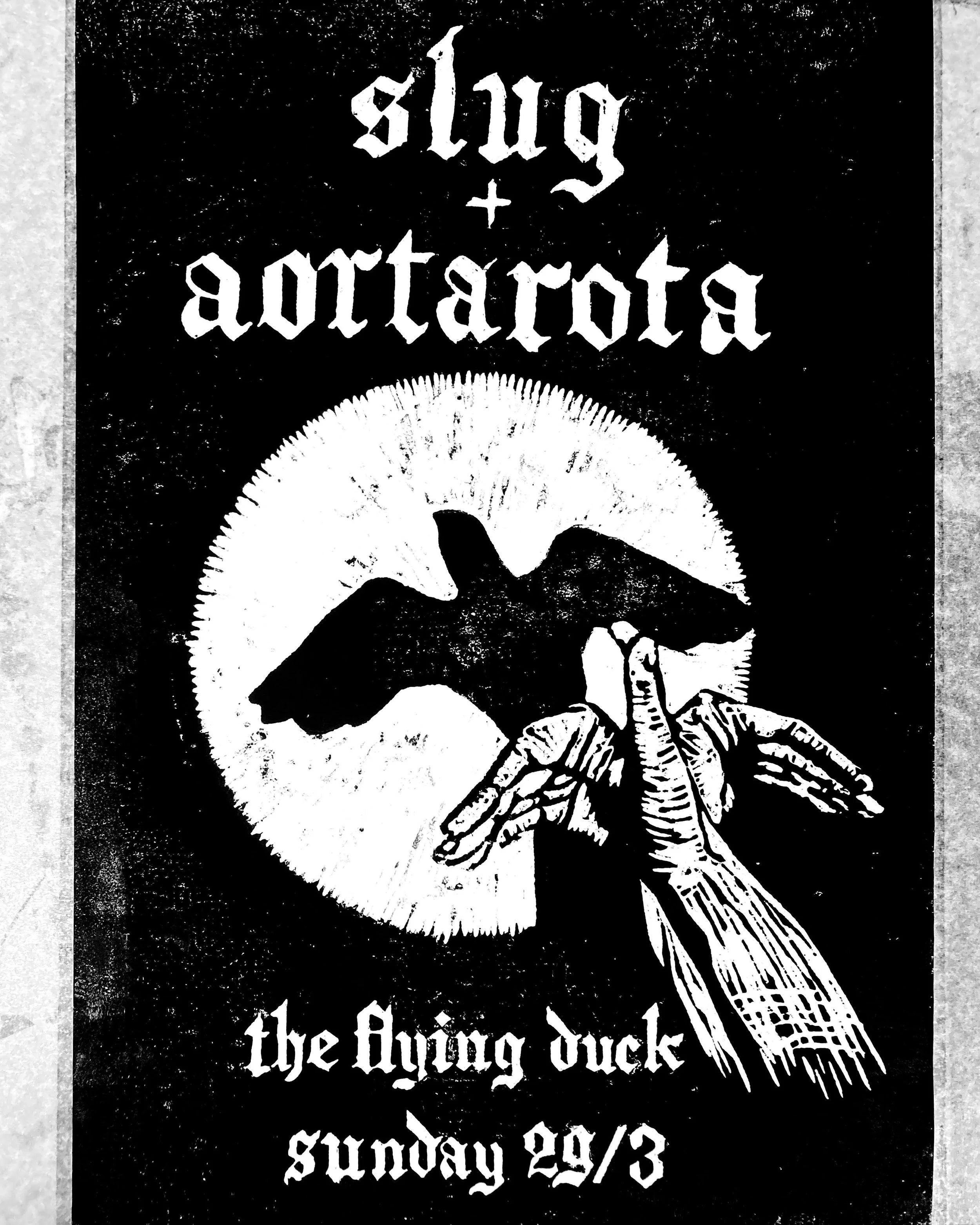 Slug return. We will be playing our first show in a good long while at THE FLYING DUCK this Sunday the 29th. Joining us in our most favourite of dark and dingy dens will be the immaculate Aortarota, who are building up to their album launch on the 30th of April. Come one, come all. Preferably all.