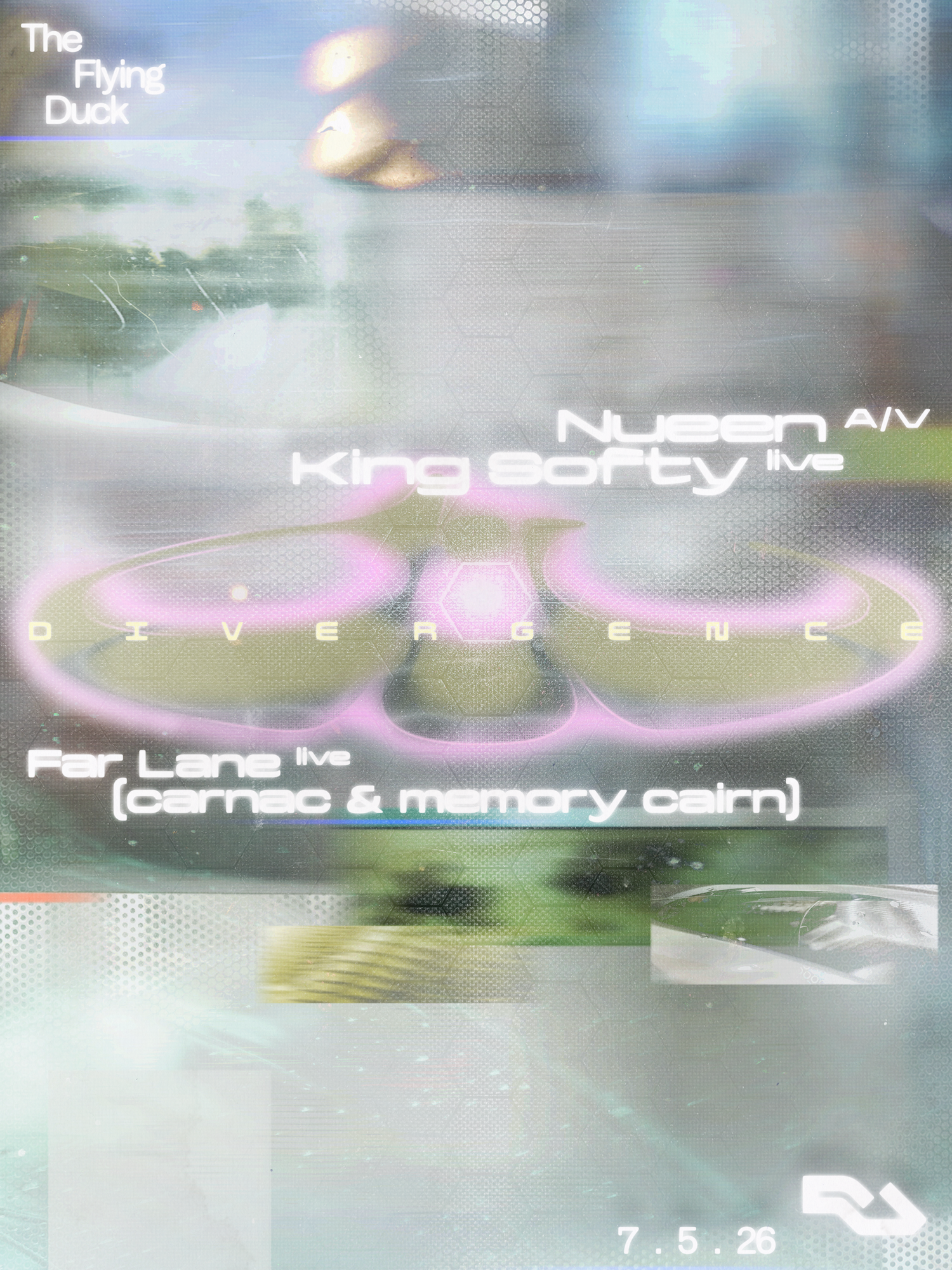 Divergence invites you to a kaleidoscopic night of ambient at The Flying Duck. .ೃ࿔ carnac and memory cairn open by easing the room into another pace, where drone, resonance and overtone gather slowly softening the edges of the evening. Far Lane follows live, carrying the space into lighter air, where melody arrives in passing and pulse stays just beneath the surface. .ೃ࿔ King Softy then shifts the grain of the night with a live set shaped as much by sequence as by sound, threading abstract beatwork, blur and tactile textures through the room. To close, Nueen brings a live A/V performance where atmospheric depth, melodic detail and rhythmic tension move together in a set that feels expansive, sonically curious and full of emotional pull. .ೃ࿔ Settle into a night where the world falls back and sound makes room for thought, feeling and the sense of leaving quietly altered. .ೃ࿔ Soundtracked by Aiolos Music should be accessible to everyone, if you can't afford the full ticket price get in touch via our instagram x
